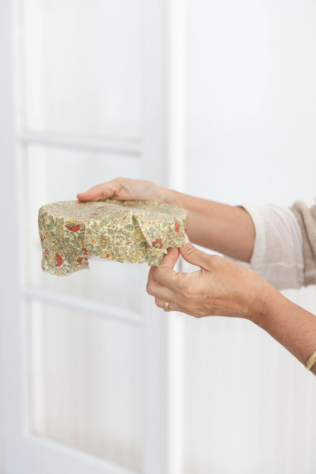Son 3 paños de tela de algodón de diferentes tamaños revestidos con cera de abeja y resina de pino, sirven para reemplazar el film en la cocina. Preguntar por los motivos que hay en stock